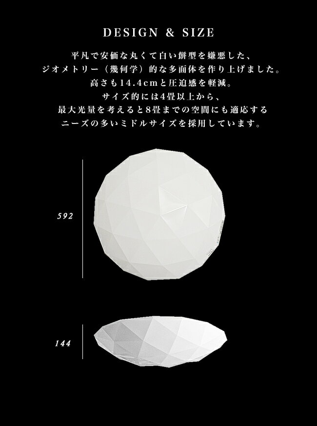 サイズ Φ592×H144(mm) 重量 2.3kg 素材 乳白アクリル スイッチ 壁/リモコン ・点灯モード切替:ON/OFF/メモリー点灯/常夜灯 ※壁スイッチの連続切替(プルレススイッチ)及びリモコンにて行えます。
