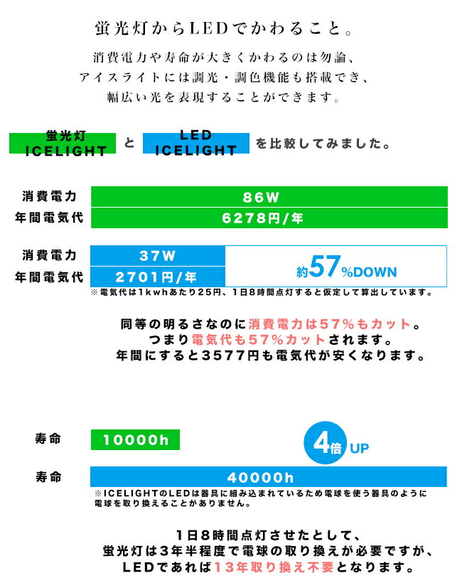 そして2017年3月より、遂にこのICELIGHTの光源が蛍光灯からLEDへとかわります!! LEDにかわることで、光の色を従来の6500K(昼光色)から2700K(電球色)まで変化させることが可能になり、さらに光の強さまで調節できるようになります。